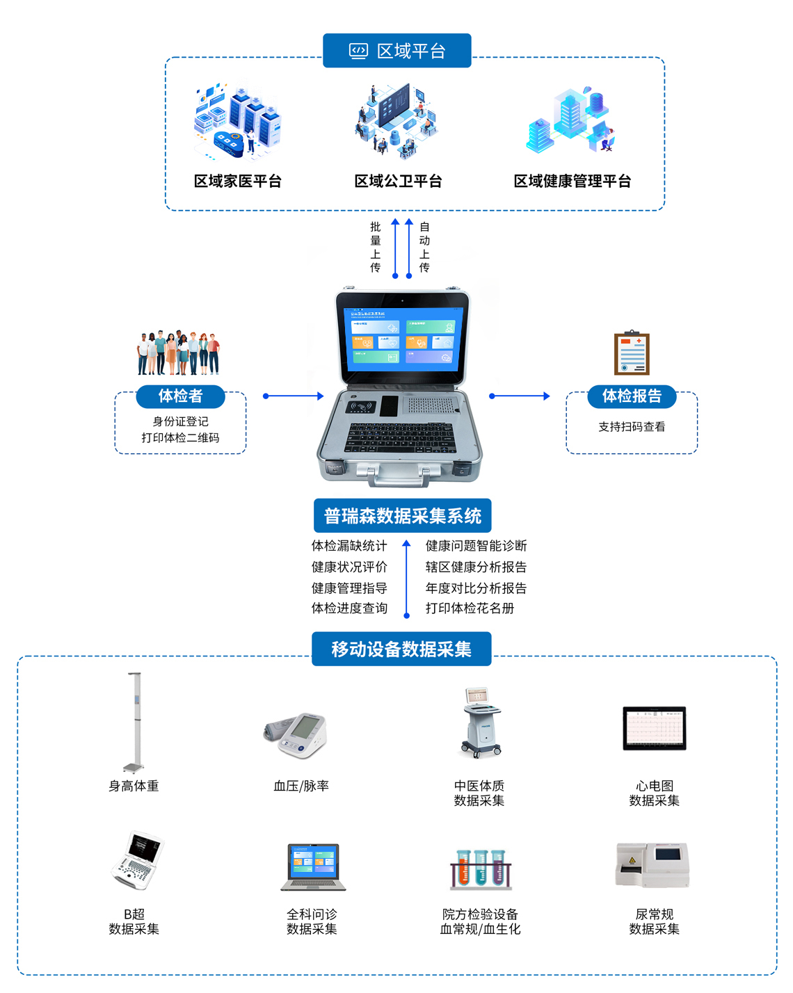 該系統(tǒng)按照縣、鄉(xiāng)、村三級(jí)應(yīng)用設(shè)計(jì),以便捷式應(yīng)用、智能化應(yīng)用、多場(chǎng)景應(yīng)用為導(dǎo)向,按照滿足院內(nèi)專業(yè)體檢、下鄉(xiāng)便攜式體檢、移動(dòng)體檢車體檢及區(qū)域化融合體檢等多種模式搭建,為基層醫(yī)療機(jī)構(gòu)公共衛(wèi)生信息化最后一公里提供一站式解決方案,實(shí)現(xiàn)國(guó)家“讓數(shù)據(jù)多跑路,百姓少跑腿”的相關(guān)要求。